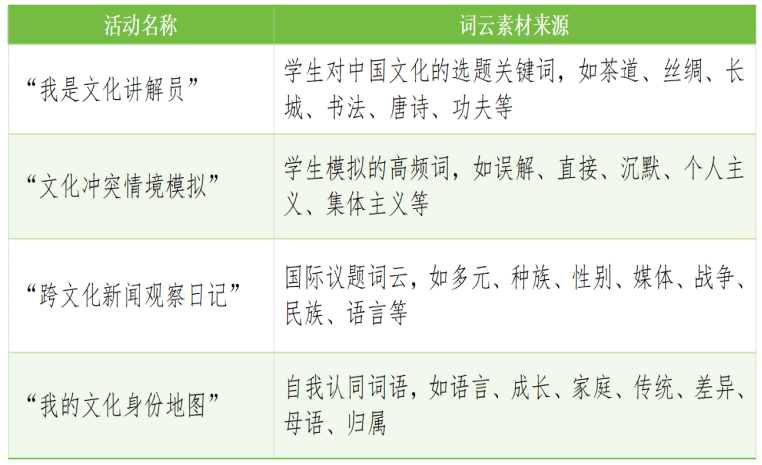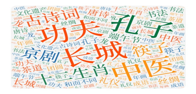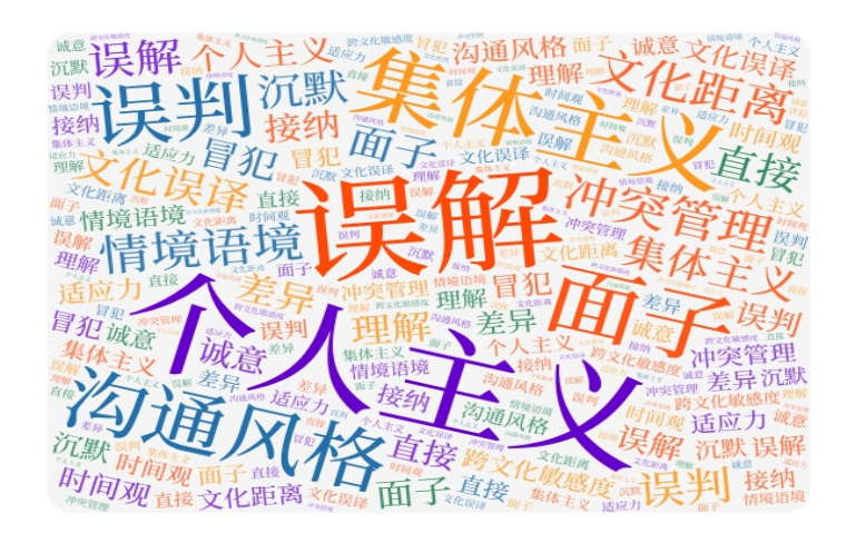 图6 “我是文化讲解员”活动词云收集 教学活动二:“文化冲突情境模拟”——角色扮演与应对策略训练 活动简介:设计几组常见的跨文化冲突案例(如中美会议沟通风格差异、日本礼仪与时间观念、阿拉伯语系国家性别观念等),学生分组扮演各国商务代表,在互动中发现问题,并提出文化适应与冲突化解方案。 思政融入点:引导学生培养尊重多元、理解差异、和平沟通的全球视野与文明交流态度;在应对中外观念差异的讨论中,潜移默化地强化爱国主义与文化包容理念。 教学目标:提高学生文化敏感度与跨文化适应力;培养问题解决与多元视角思维能力。