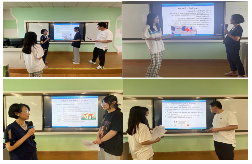 图9 学生比赛现场 3)AI技术赋能真实交际场景模拟 课程引入AI模拟系统,设计典型跨文化交流场景,让学生通过角色扮演沉浸式体验文化冲突、协商互动、情境应对等真实情境,提升其实战演练能力与应变能力。 4)思政教育与专业教学的深度融合 课程从教学设计、课堂活动到任务考核全过程中,深入融入社会主义核心价值观与中华优秀传统文化,引导学生在跨文化情境中树立国家认同、文化自信与社会责任感,实现专业育人与价值育人的协同育人目标。 |